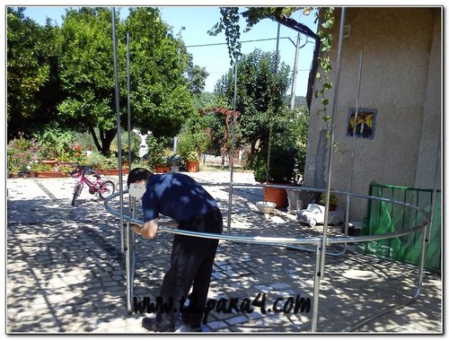 Inicialmente, um monte de ferros, lonas, molas, plásticos, tubos, rede e cordeis. E eu e o marido a conjugar tudo aquilo perante o olhar atento e supervisor das piolhas.