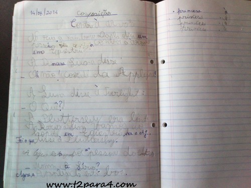 Uma das piolhas, de há uns dias para cá, descobriu que é giríssimo escrever (à mão, no seu caderno, com lápis e borracha) histórias que inventa. Eu acho isto, pura e simplesmente, fantástico, ainda que, no final, depois das correções, tenha que interpretar o que ela quer transpor para o papel pois aquilo que pensa é mais rápido do que aquilo que escreve e sai um texto um pouco confuso.